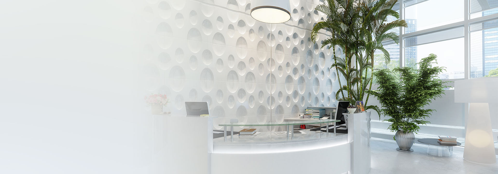 Structured floral or trees and plants work well in most dealerships and large office spaces to soften and divide open plan spaces.